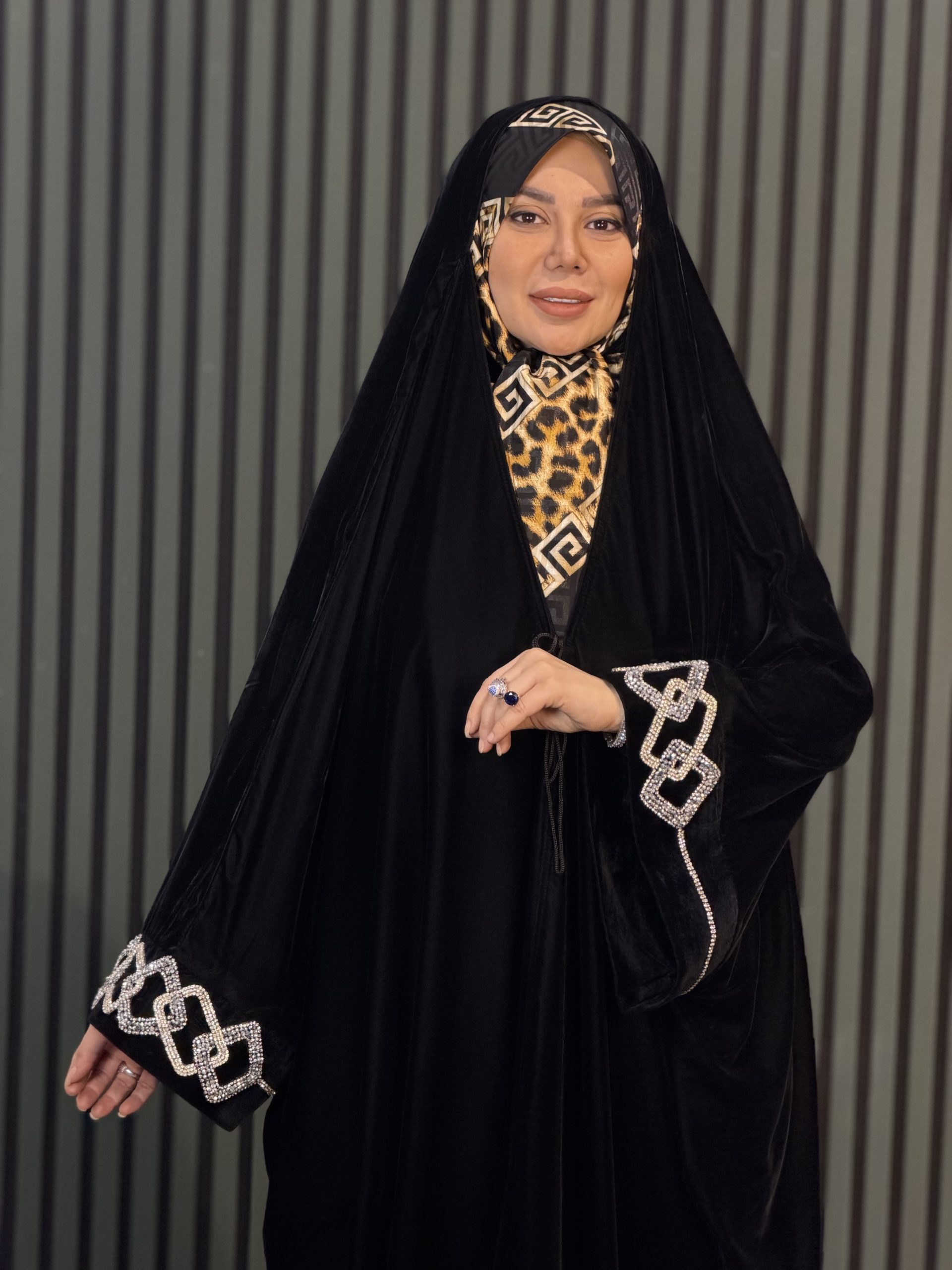 مدل چادر به سبک کاملاً عربی اصیل طراحی شده و با جواهردوزی‌های درخشان برند سوآرُسکی (Swarovski) تزئین شده است که رنگ آن‌ها ثابت بوده و در برابر شست‌وشو و مرور زمان تغییر نمی‌کند. این ترکیب از اصالت، کیفیت و درخشش، انتخابی لوکس و ماندگار برای بانوان خوش‌سلیقه است.