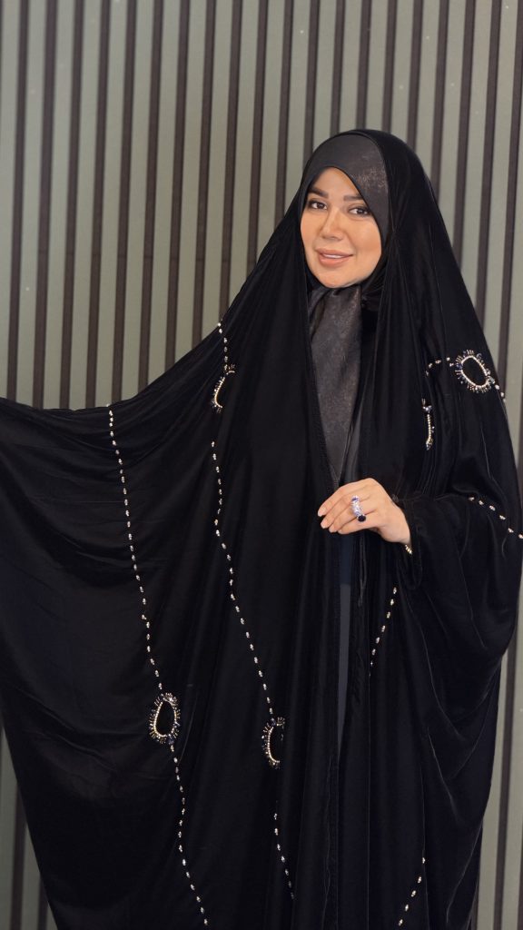 مدل چادر به سبک کاملاً عربی اصیل طراحی شده و با جواهردوزی‌های درخشان برند سوآرُسکی (Swarovski) تزئین شده است که رنگ آن‌ها ثابت بوده و در برابر شست‌وشو و مرور زمان تغییر نمی‌کند. این ترکیب از اصالت، کیفیت و درخشش، انتخابی لوکس و ماندگار برای بانوان خوش‌سلیقه است.