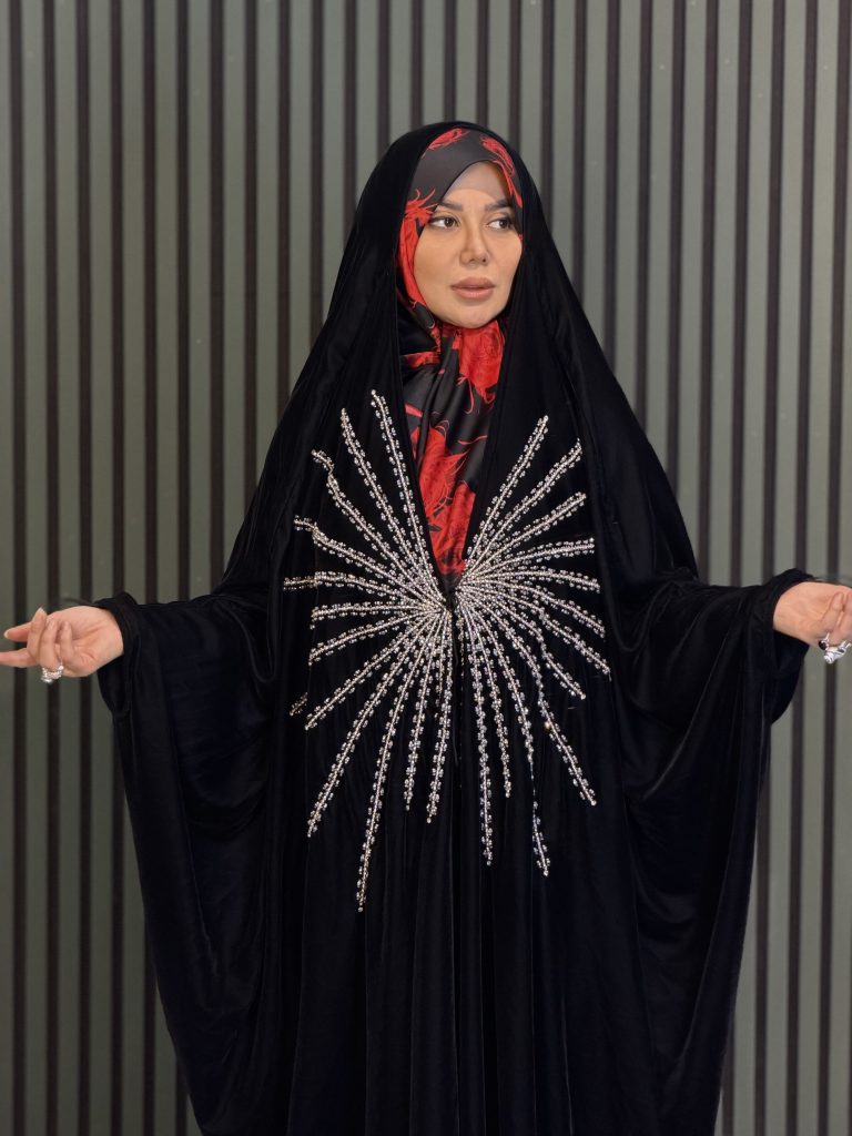مدل چادر به سبک کاملاً عربی اصیل طراحی شده و با جواهردوزی‌های درخشان برند سوآرُسکی (Swarovski) تزئین شده است که رنگ آن‌ها ثابت بوده و در برابر شست‌وشو و مرور زمان تغییر نمی‌کند. این ترکیب از اصالت، کیفیت و درخشش، انتخابی لوکس و ماندگار برای بانوان خوش‌سلیقه است.