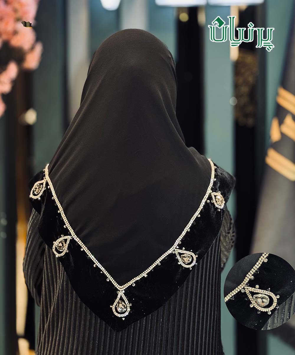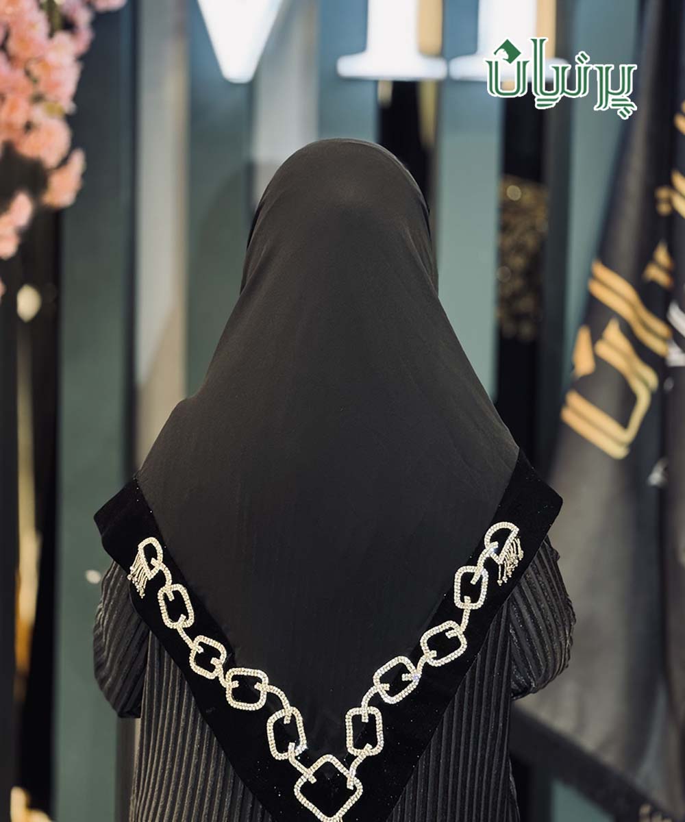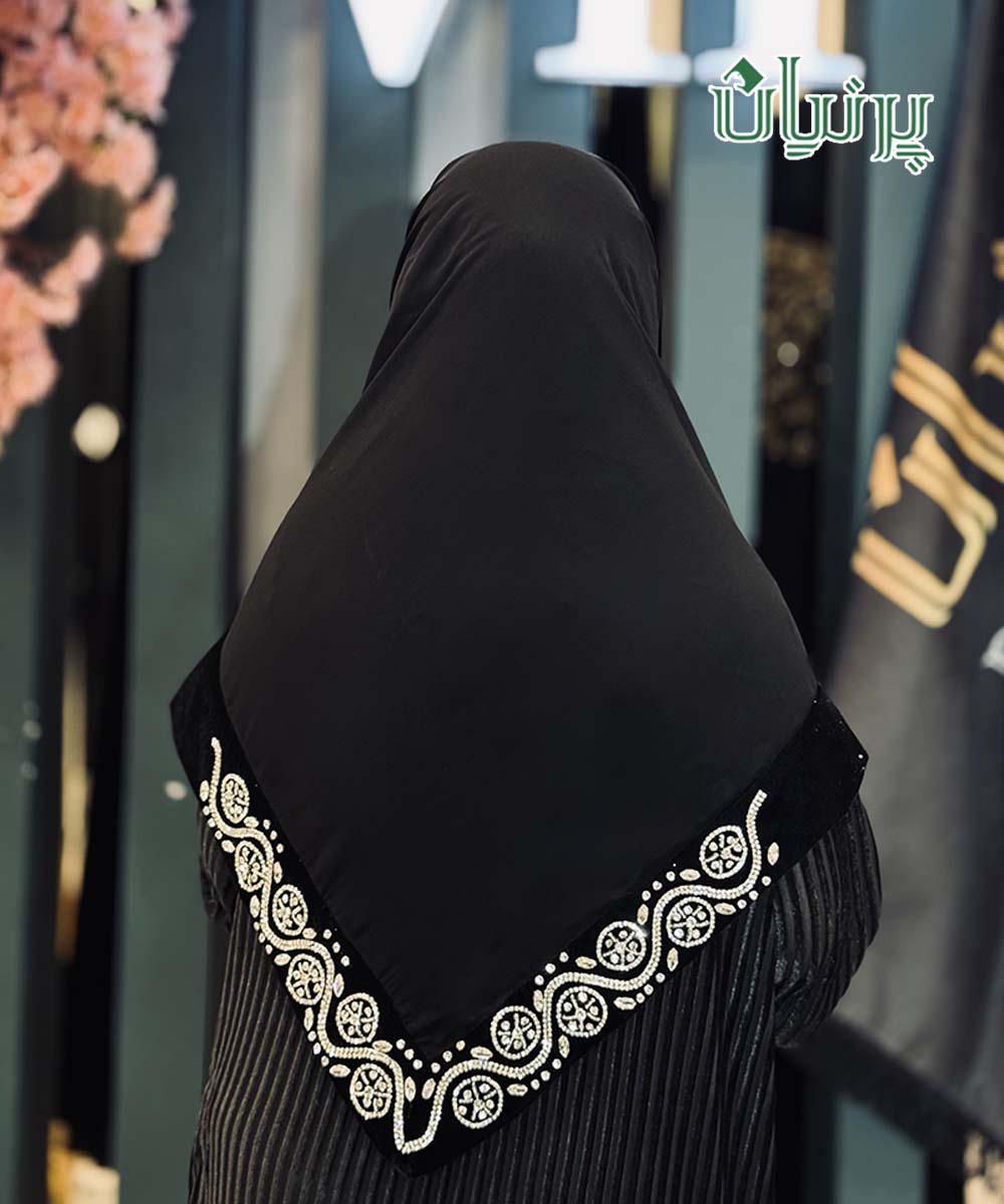 روی روسری از جواهر دوزی اصل برند سوآرسکی استفاده شده؛ جواهردوزی ای با درخشش ثابت، کیفیت بالا و بدون تغییر رنگ که با گذر زمان زیبایی خود را از دست نمی‌دهند.